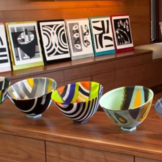 "I see fused glass as a fantastically versatile reflective and transmissive canvas for color and form," says Shandra McLane. "I'm particularly intrigued with Scandinavian and Modernist designs. I find myself creating patterns with similar structure." The vehicle for her patterns—always complex and colorful—are kiln-formed fused glass bowls, called vessels in the craft world.